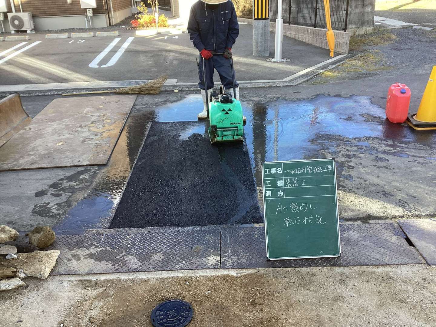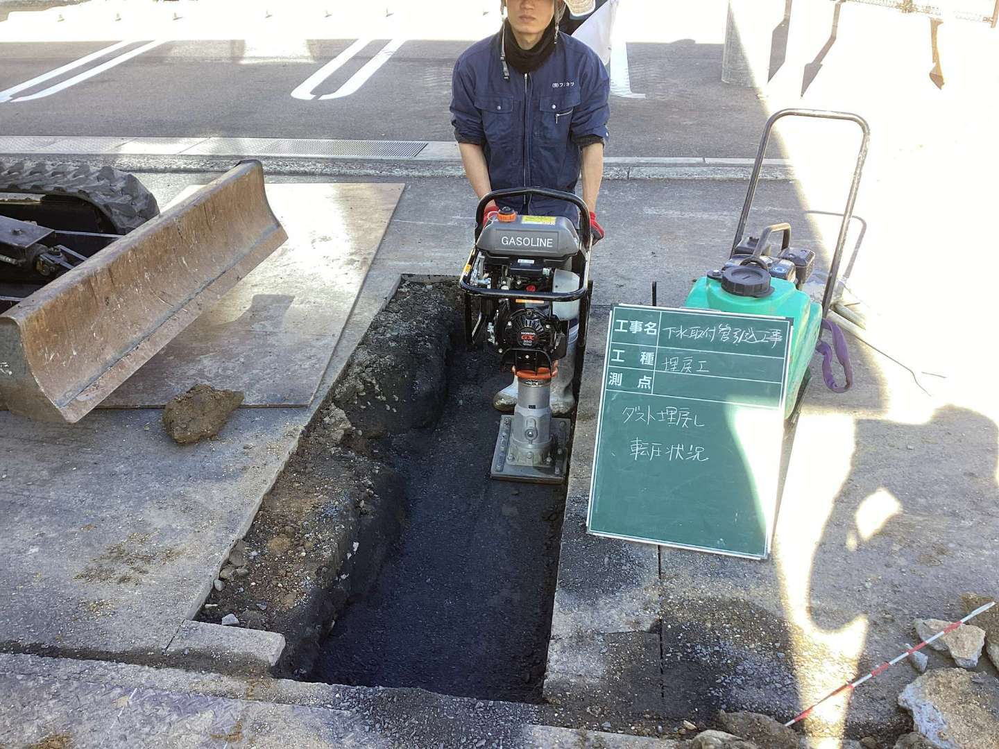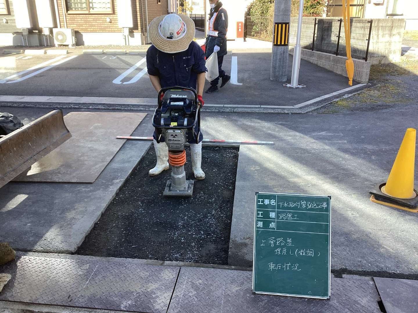 配管完了後は、基礎部分にダスト材を使用して丁寧に転圧し、さらに上層路盤材を用いた埋め戻しと段階的な転圧作業を経て、舗装の原状復旧を行いました。